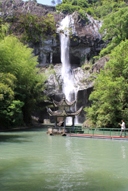 沿著石階,一個(gè)峰回路轉(zhuǎn)就到了龍吟潭邊,抬頭就會看到瀑布從90米高的懸崖上瀉入龍吟潭。站在壩上,撲面迎來一股涼爽的水汽。龍吟潭底建有水底龍宮,供人游覽,游玩龍宮出來后就坐小木船入洞游覽勝景。看了瀑布底下的5個(gè)小洞,船就進(jìn)入冬暖夏涼的龍游洞,一到洞內(nèi)碼頭,就看到洞內(nèi)的巨大洞窟,不看路標(biāo)說不定還會繞暈?zāi)?,游了水簾洞,盤龍瀑就進(jìn)入臥龍?zhí)?,靠著巖壁入洞中,盤繞上有33米高的圓壁樓梯就是懸空洞,從梯頭拍洞景,往下拍像玫瑰花,向前拍像洞中長廊,洞中倆旁洞室相連,有人防洞,會議廳,餐廳,廁所,廚房和洞宇文化宣傳窗。